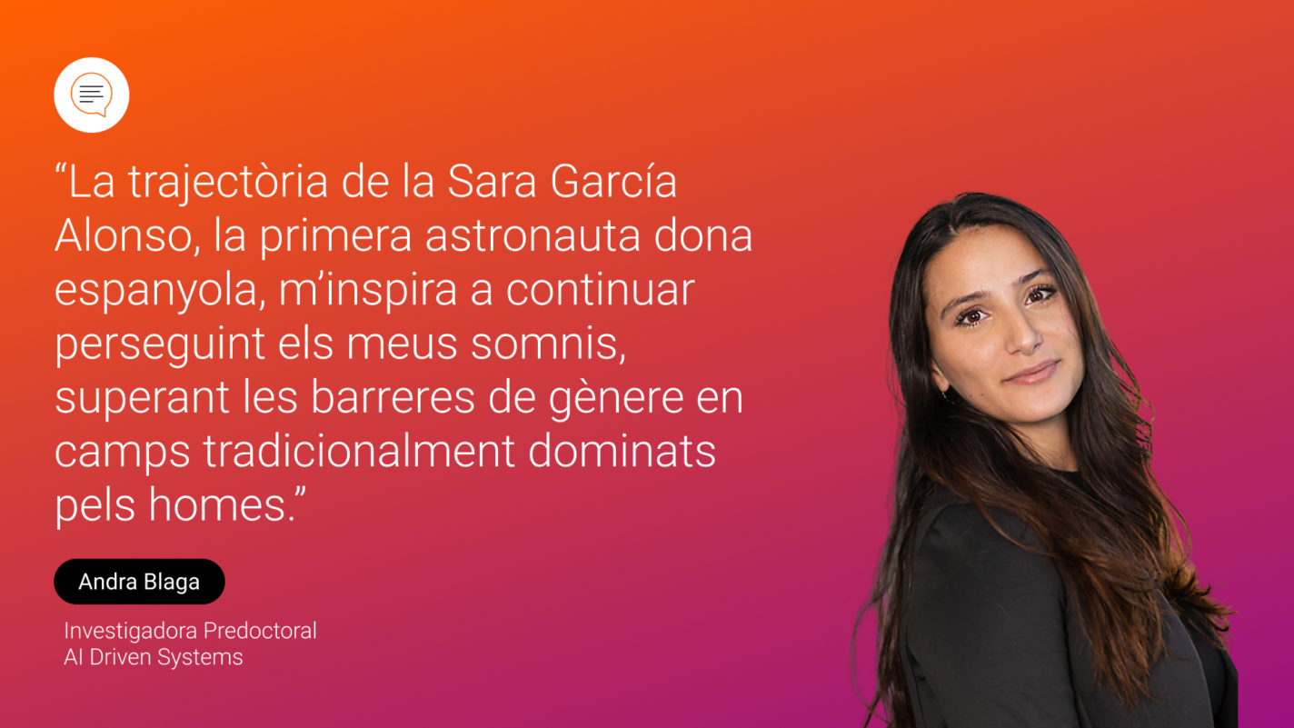 A.B.: Considero a la Sara García Alonso, la primera astronauta dona espanyola, com una referent. La seva trajectòria m’inspira a continuar perseguint els meus somnis, superant les barreres de gènere en camps tradicionalment dominats pels homes. Em motiva a pensar que, algun dia, també podré ser la primera dona a aconseguir alguna cosa significativa en el meu camp. A més, vinc d’una família en què les dones han estat les que han tirat endavant i han demostrat una gran fortalesa, cosa que reforça encara més la meva determinació de seguir aquest camí.