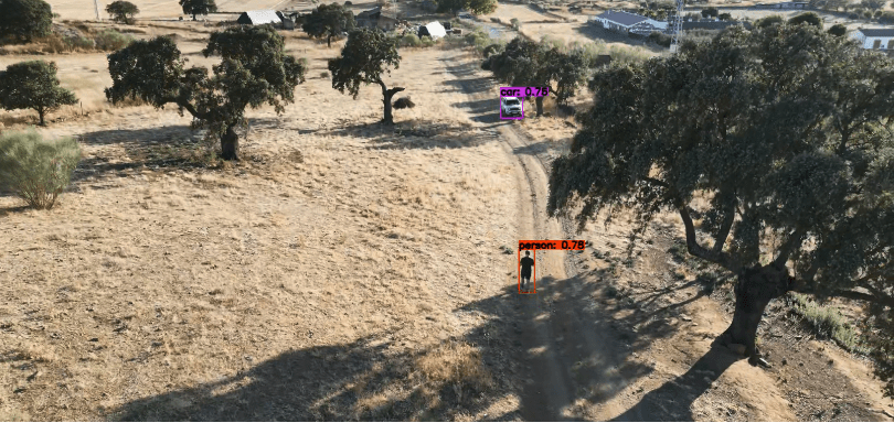 Fig.1 Real-time object detection with MOTCAM, identifying humans and vehicles in a rural environment using edge AI processing.