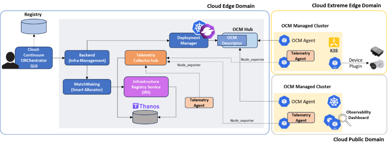 The following diagram reflects the infrastructure with the different computing environments or domains in the cloud, covering from the extreme edge to the public cloud. It represents the diversity of cloud computing and is capable of enabling the convergence of devices and environments across the cloud continuum.