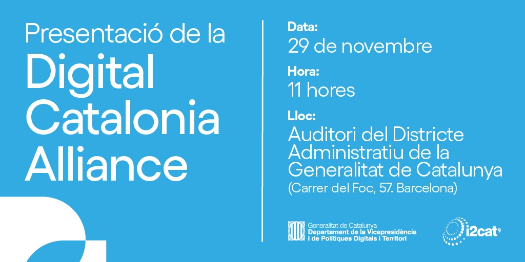 Presentació de la Digital Catalonia Alliance, una nova iniciativa del Departament de la Vicepresidència i de Polítiques Digitals i Territori que busca l’impuls i dinamització de l’ecosistema tecnològic emergent. Durant l’acte s’explicaran els objectius i funcions que cerca aquesta nova aliança i s’exposaran les activitats que es realitzaran en les cinc comunitats tecnològiques que la […]