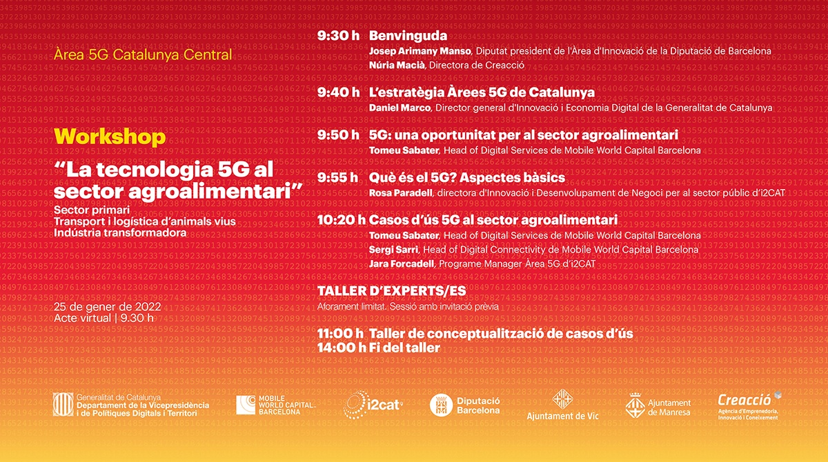 Workshop de l'àrea 5G 'Catalunya Central' amb un enfocament específic en el sector primari, transport i logística d’animals vius i indústria transformadora. L’esdeveniment, que s’emetrà de forma virtual, compta amb una primera part explicativa, on es presentarà l’estratègia Àrees 5G de Catalunya i s’explicarà amb detall què és i quins beneficis pot aportar en el sector […]