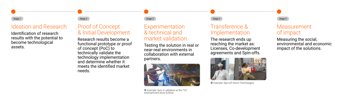Les innovacions que i2CAT ha presentat durant la fira són exemples del procés de transferència tecnològica que es duu a terme al centre, des de la fase inicial de recerca fins a la comercialització del producte resultant, la llicència tecnològica a tercers o la creació d’una empresa derivada, com ara la recentment presentada Volum Technologies.