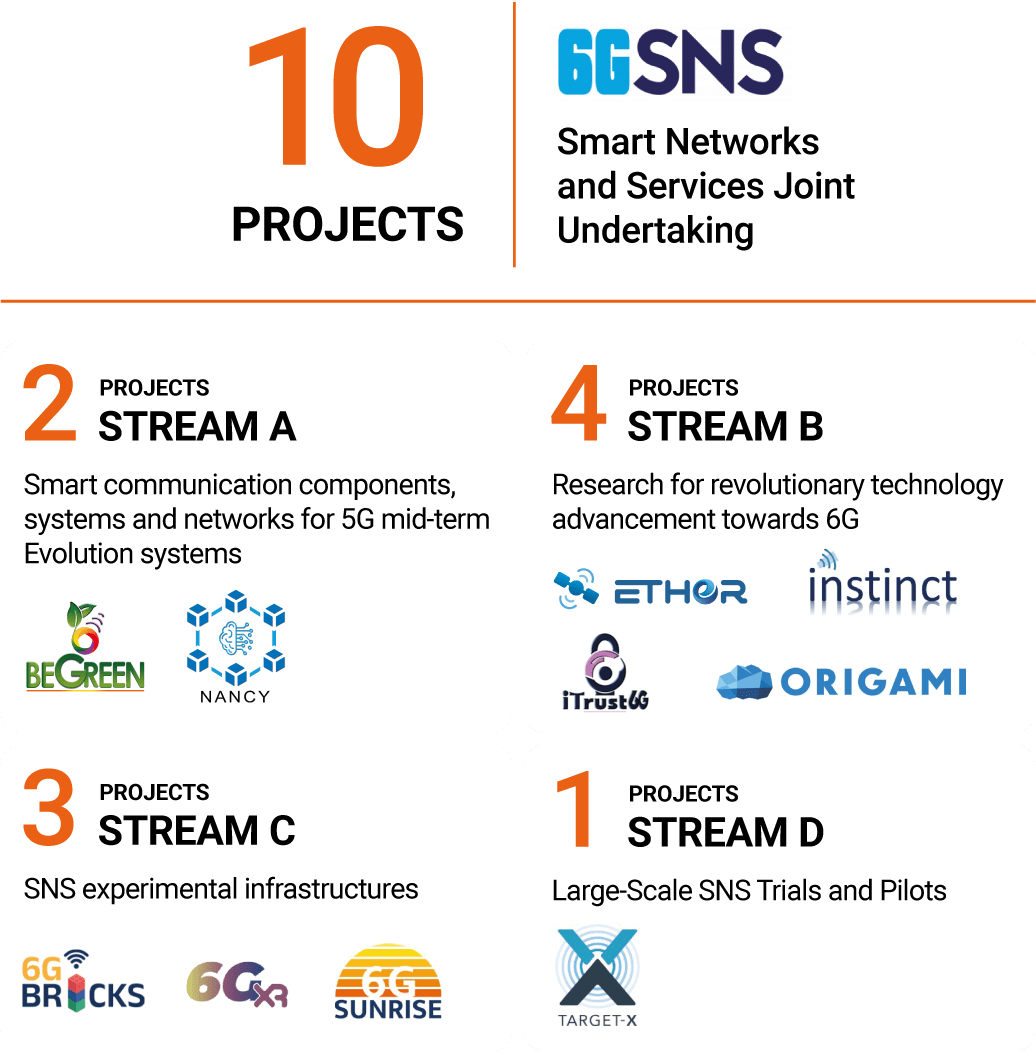 i2CAT was awarded 6 projects within the first call of the 6G SNS JU (2023-2025) and another 4 within the second call of the programme (2024-2026), guaranteeing its active participation in the four large Streams that define the research programme. With 10 active projects, i2CAT keeps consolidating its role as a key actor in the European 6G research arena.