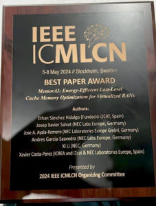 A scientific article led by researchers from the AI-Driven Systems area of the i2CAT Foundation, Xavier Costa and Ethan Sánchez, has won the “Best Paper Award” during the IEEE International Conference on Machine Learning for Communication and Networking 2024 (IEEEICMLCN), held in Stockholm (Sweden) between 5 and 8 May. The IEEE ICMLCN is one of the most important international conferences on Machine Learning and telecommunications networks. Each year brings together researchers from all over the world to jointly promote fundamental and applied research in this field.